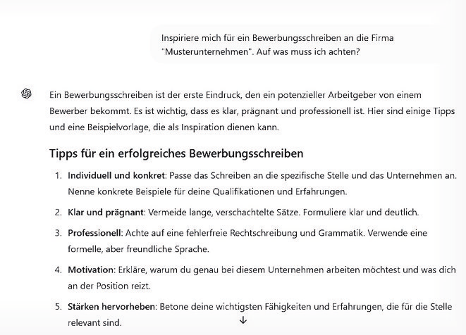 „Die eigene Handschrift und Persönlichkeit müssen immer erkennbar sein“, sagt auch die Karriereberaterin Esther Kimmel. Oft müssen Bewerberinnen und Bewerber einen Anschreiben, das ein KI-Chatbot verfasst hat, wieder mehr Leben und Individualität einhauchen. „Aber ich finde es klug, sich hier inspirieren zu lassen.“ Wichtig: Den Ergebnissen keinesfalls blindlings vertrauen, sondern mit ein bisschen Abstand so finalisieren, dass der eigene Stil erkennbar ist.